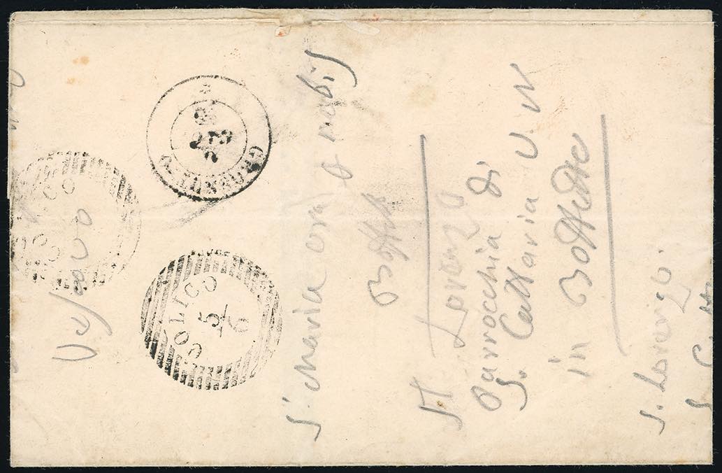 DONGO SI + COLICO LO coannullatori, non catalogato - 20 cent. IV emissione di Sardegna (15C), perfetto, su sovracoperta di lettera scritta a Stazzona 3/6/1860 diretta a Grosio. Di eccezionale interesse il percorso intorno al lago di Como, prima di raggiungere la Valtellina, con doppio annullamento non dovuto a rispedizione. Per specialista, da studiare. Cert. Ferrario. Ex collezione Rothschild.