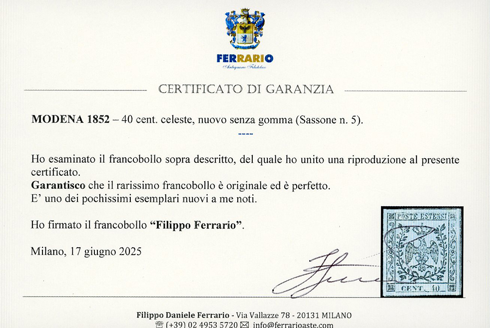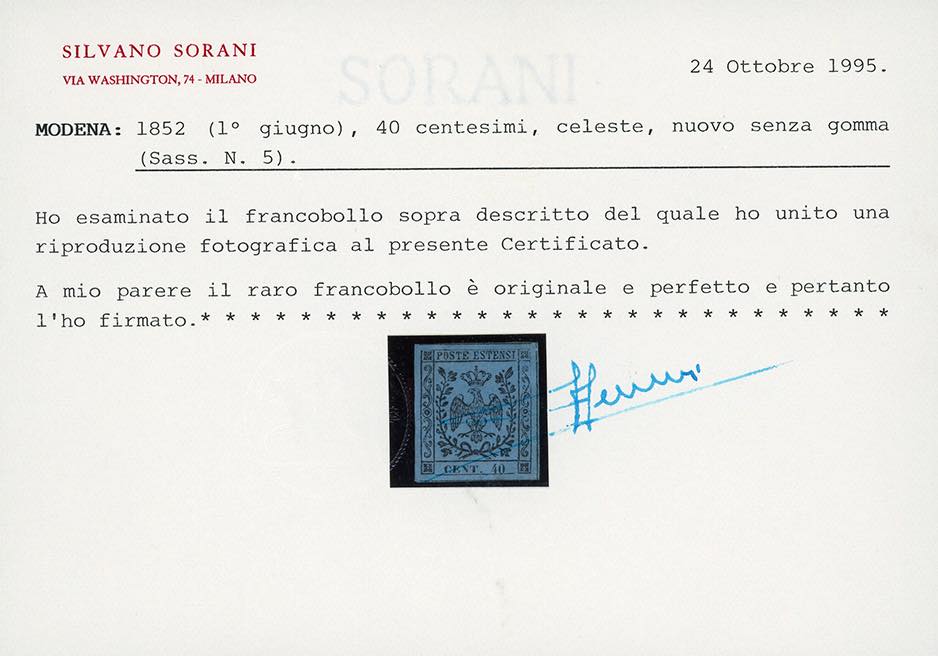 1852 - 40 cent. celeste (5), ben marginato, nuovo, senza gomma come sempre, perfetto. Si tratta di uno dei francobolli più rari di tutti gli Antichi Stati Italiani allo stato di nuovo, pochissimi esemplari noti. Cert. Sorani e Ferrario.
