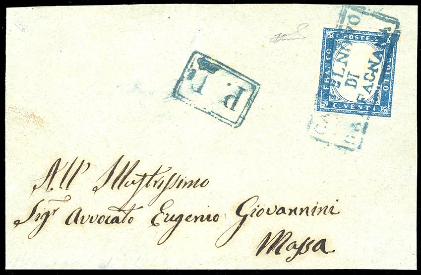 CASTELNUOVO DI GARFAGNANA, cartella azzurra punti 13 - 20 cent. IV emissione di Sardegna (15B), su frontespizio di lettera per Massa. Ferrario. (cat.Sassone € 4.500 come frontespizio).