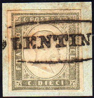 LENTINI, punti R3 - 10 cent. (Sardegna 14C), perfetto, usato su piccolo frammento. Molto raro, due soli frammenti noti. Ex coll. Aquila.