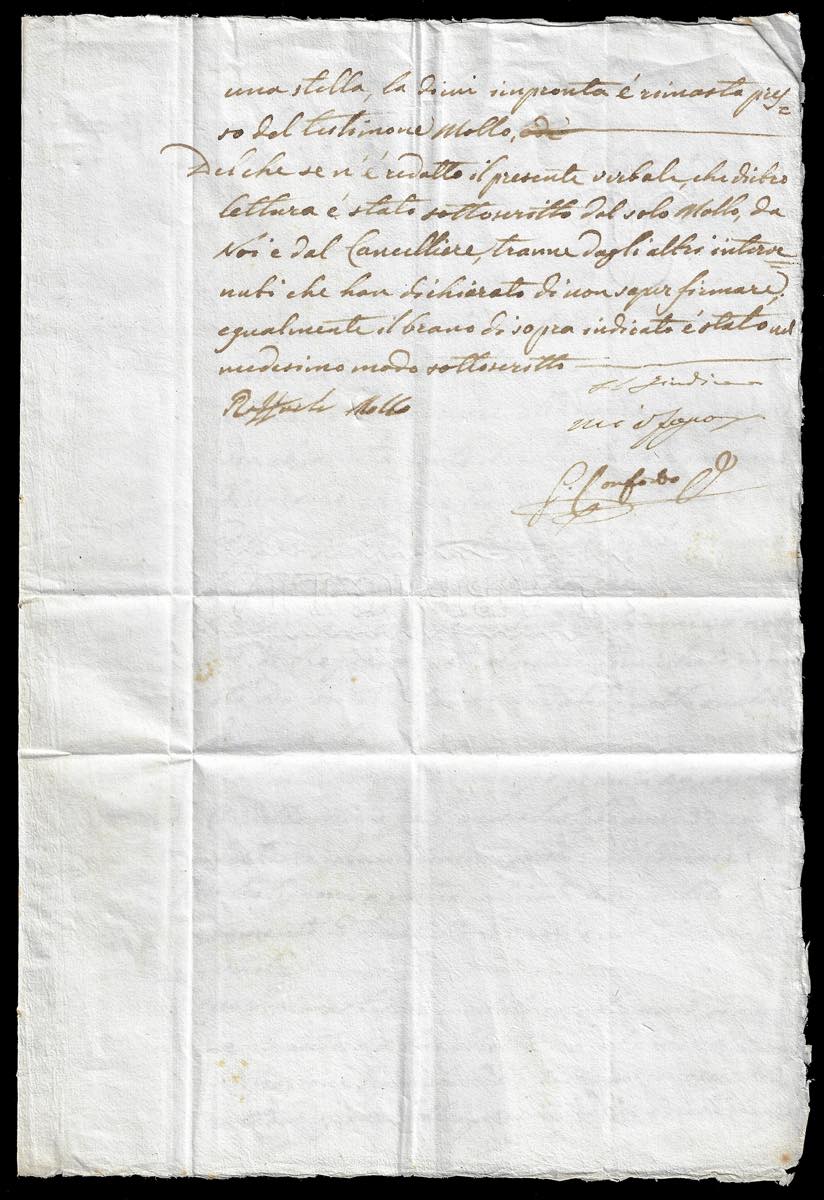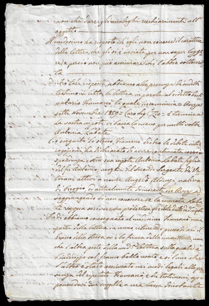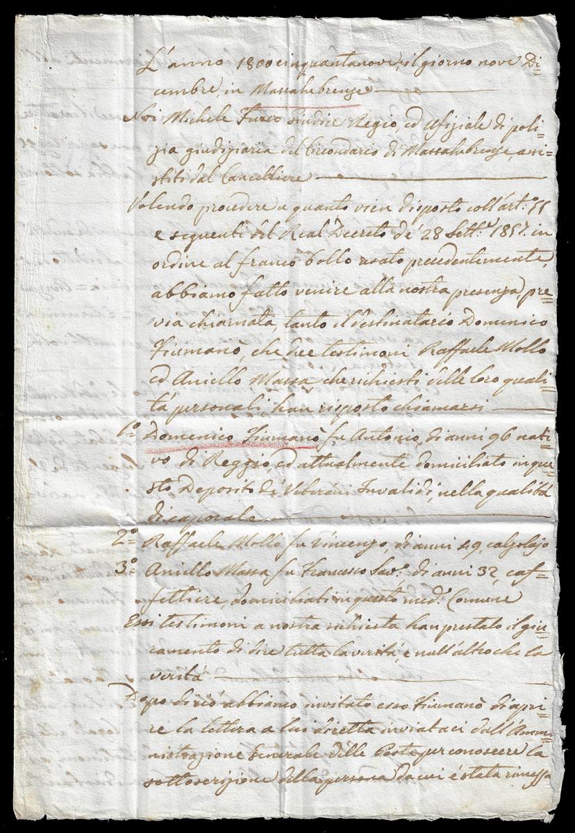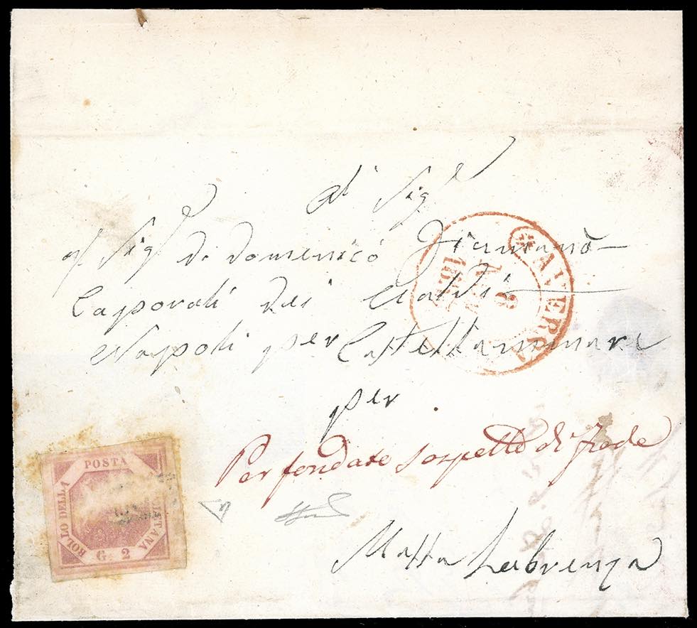 1859 - 2 grana rosa brunastro, I tavola (5), palesamente già usato e riutilizzato in frode postale, non annullato, su fresca lettera da Aversa 8/11/1958 a Massa Lubrense, manoscritto "Per fondato sospetto di frode". Alla missiva è ancora allegato il verbale in cui si convocava il destinatario della lettera per ottenere informazioni sul mittente, autore del tentativo di frode. Documento di grande fascino ed interesse storico postale, estremamente raro. Per collezionista specializzato ed avanzato. E.Diena, Ferrario. Ex coll. Imperato.
