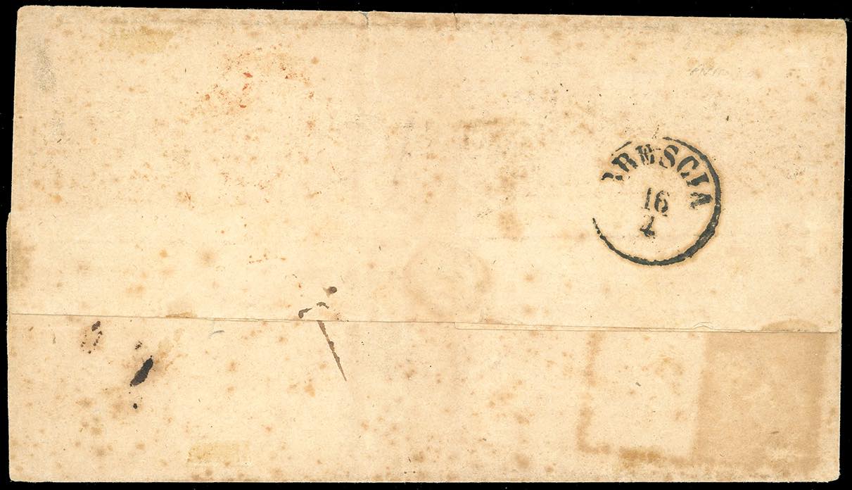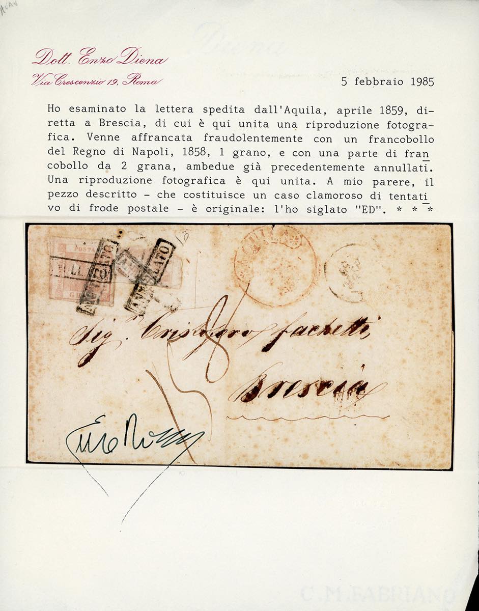 1859 - 2 grana, frazionato verticalmente a metà a mano, e 1 grano (7,4), entrambi precedentemente annullati e riutilizzati in frode, su lettera da L'Aquila aprila 1859 a Brescia, tassata in arrivo. ECCEZIONALE ED UNICO CASO NOTO DI FRAZIONAMENTO DI UN FRANCOBOLLO DA 2 GRANA. Per meglio nascondere la frode, il francobollo venne coperto con due impronte incrociate del bollo "annullato" in cartella. Grande rarità del Regno di Napoli. Cert. E.Diena.