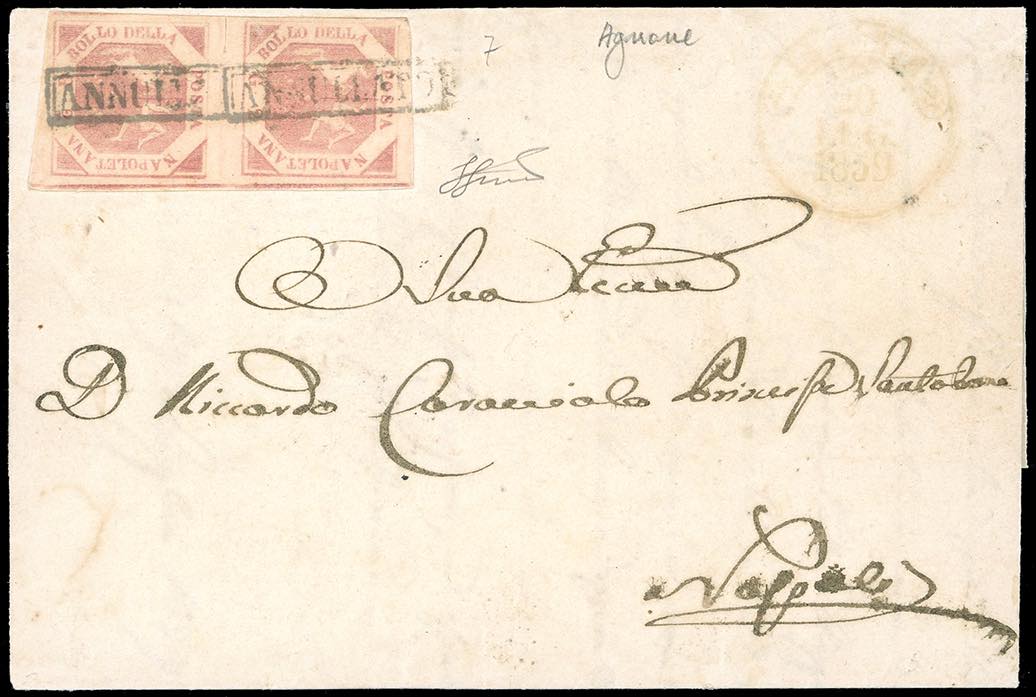 AGNONE, annullato + cerchio punti 6 - 2 grana (7), coppia, perfetta, su lettera da Agnone 20/7/1859 per Napoli. Ferrario.