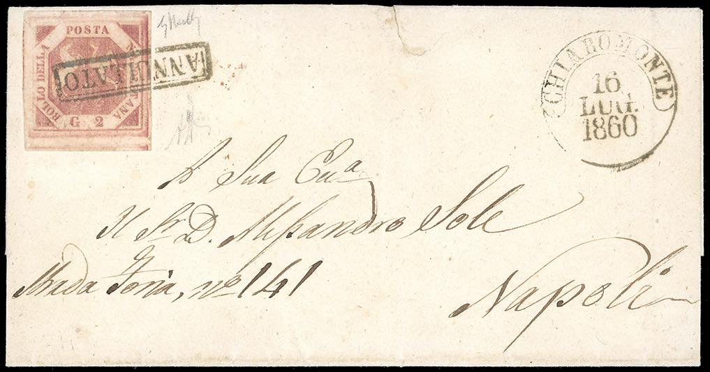 CHIAROMONTE, annullato + cerchio punti 6 - 2 grana (5d), perfetto, su lettera del 16/7/1860 per Napoli. Bella! A.Diena, Chiavarello.