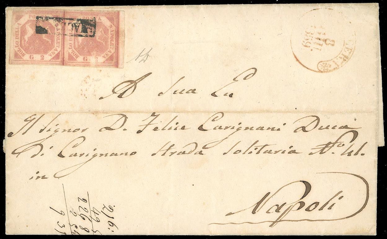 GIACENTE, lineare in cartella punti 9 - 2 grana (5), coppia orizzontale, bordo di foglio, ben marginata, un esemplare con piccola abrasione, su lettera da Lucera 8/6/1859 a Napoli. Annullo raro e sottoquotato. A.Diena.