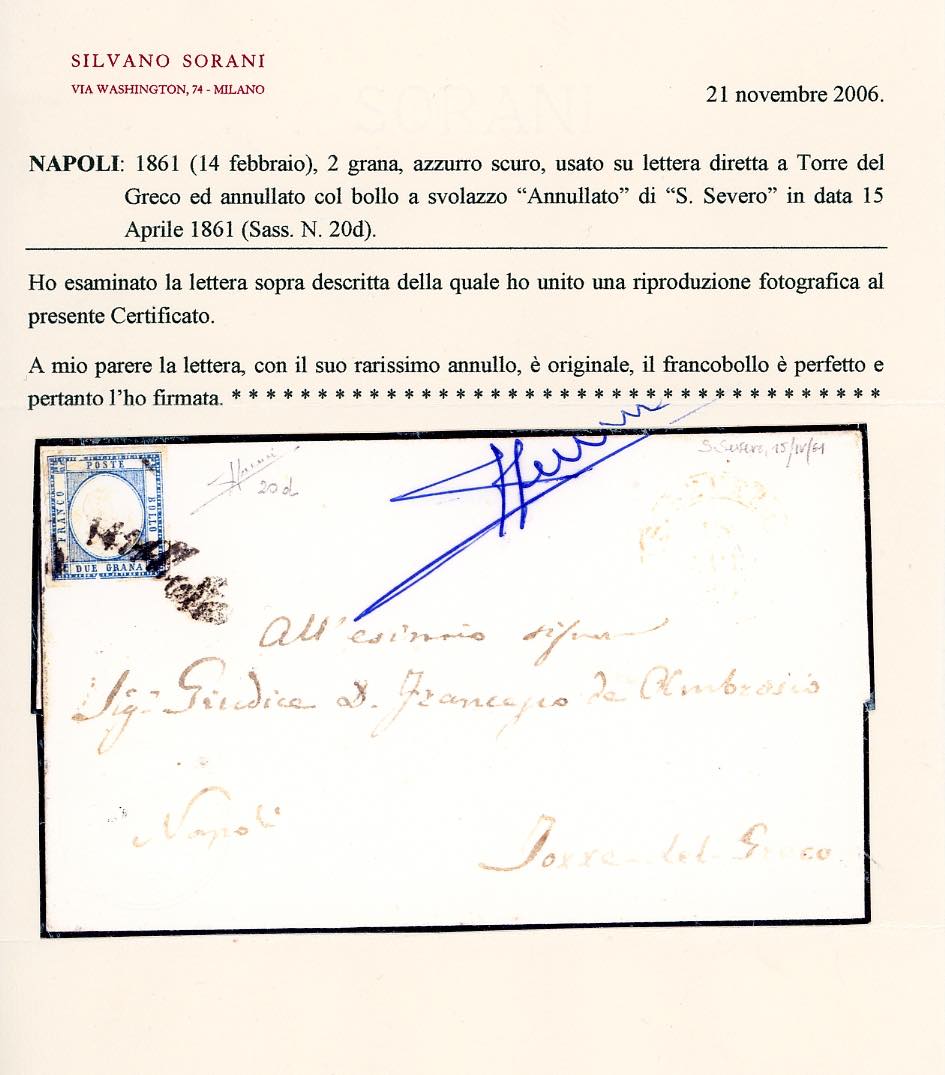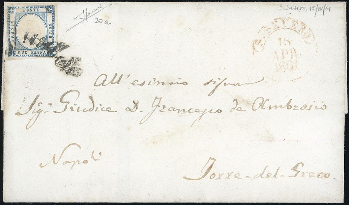 SAN SEVERO, svolazzo + cerchio rosso punti R1 - 2 grana (20d), perfetto, su sovracoperta di lettera del 15/4/1861 a Torre del Greco. Molto rara. Cert. Sorani.