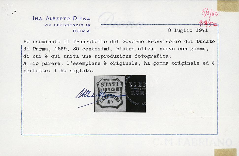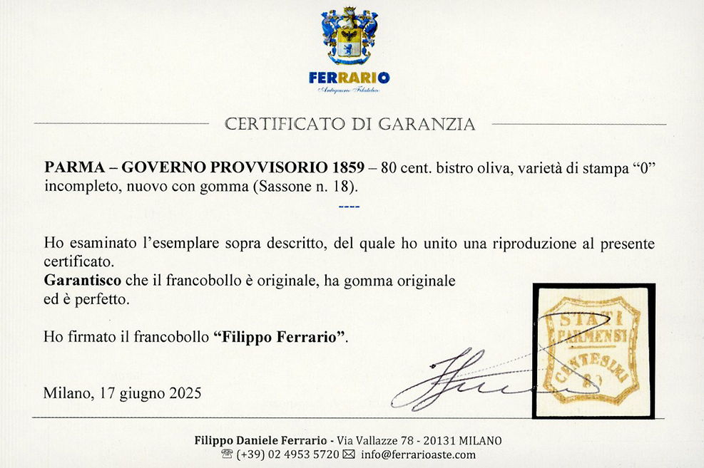 1859 - 80 cent. bistro oliva (18), varietà di stampa "0" incompleto, nuovo, gomma originale, perfetto. Molto bello. G.Oliva, cert. A.Diena 1971 e Ferrario.