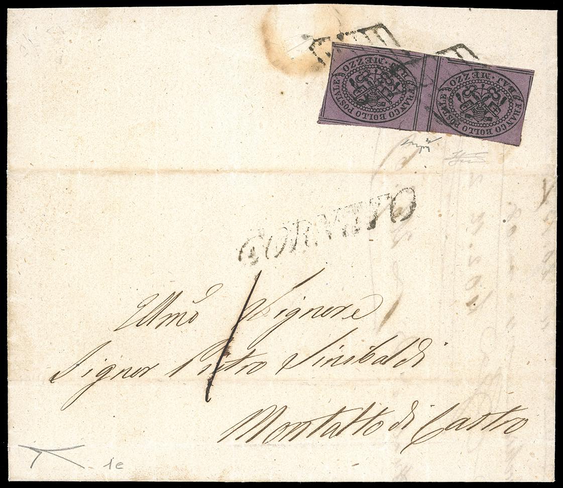1862 - 1/2 baj lilla vivo (1e), coppia orizzontale con al centro l'interspazio di gruppo, ottimo stato, al verso di lettera in porto assegnato da Corneto 29/9/1862 a Montalto di Castro, tassata sul fronte 1. UNA DELLE DUE LETTERE NOTE CON INTERSPAZIO DI GRUPPO DI QUESTA RARA TONALITA' DI COLORE. Rarità da esposizione. Chiavarello, Ferrario, cert. Bottacchi. Ex coll. Imperato.