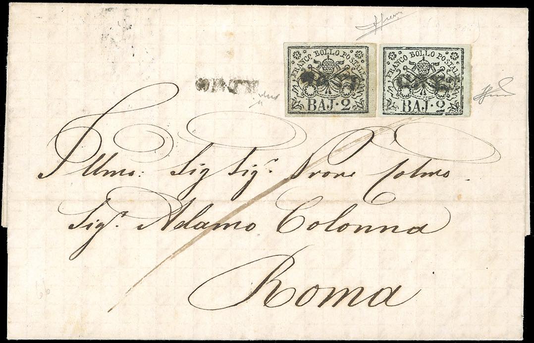 1866 - 2 baj grigio azzurrastro (3Ab), due esemplari di colori nettamente differenti, perfetti, su lettera scritta a Bomarzo 27/3/1866 e postalizzata a Orte per Roma. Pregevole affrancatura di valori gemelli, di ottima qualità. Sorani, Chiavarello, Ferrario.