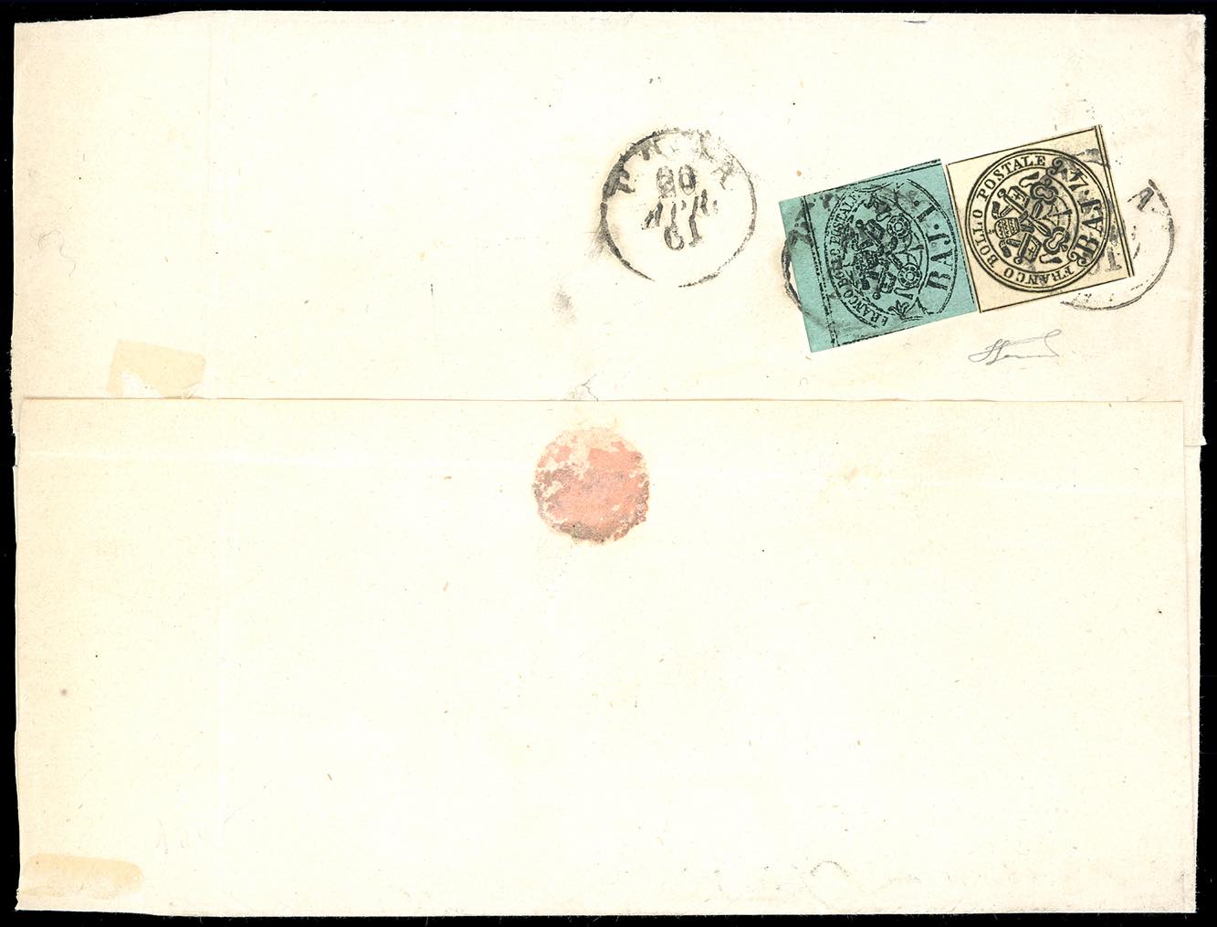 1861 - 4 baj giallo chiaro, 1 baj verde scuro, I composizione (5Ab,2A), perfetti a ben marginati, al verso di lettera in porto assegnato per Roma 20/4/1861, tassa 5 baj sul fronte. Rara affrancatura al verso, non catalogata per queste tinte. Ferrario.