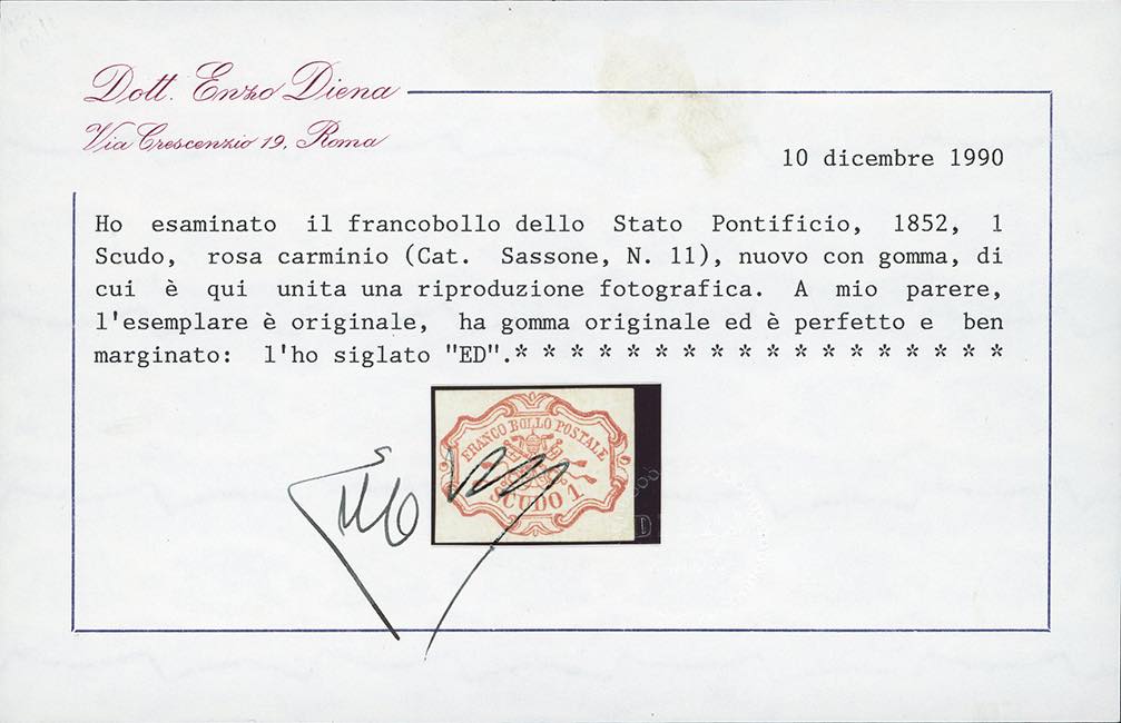 1852 - 1 scudo rosa carminio (11), nuovo, gomma originale, perfetto e ben marginato. Bello. Cert. E.Diena e Ferrario.