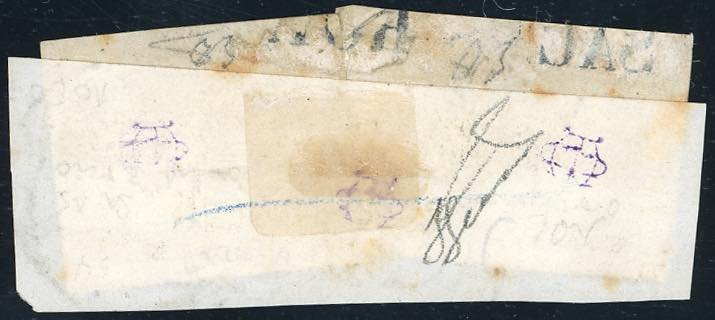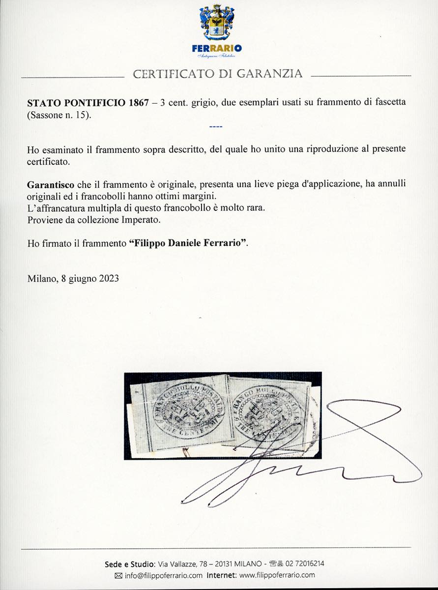 1867 - 3 cent. grigio (15), due esemplari, ottimi margini, usati su frammento di fascetta, lieve piega d'applicazione. Affrancatura multipla di questo francobollo molto rara. Emilio Diena, cert. Ferrario. Ex coll. Imperato.