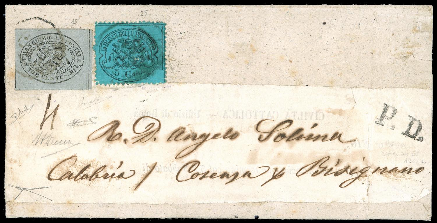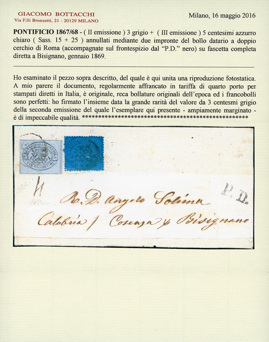 1869 - 3 cent. grigio II emissione, perfetto e con i filetti completi su tutti i lati, 5 cent. azzurro III emissione (15,25), su fascetta completa per stampati di quattro porti da Roma gennaio 1869 a Bisignano. Sono note solo 5 lettere e 8 fascette affrancate con il 3 cent. grigio della II emissione. Grande rarità di qualità eccezionale, da esposizione! Renato Mondolfo, cert. Alberto Diena, Bottacchi e Ferrario.