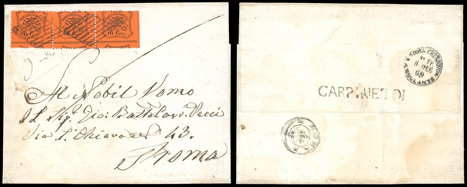1869 - 10 cent. arancio vermiglio (26), striscia orizzontale di tre con dentellatura orizzontale fortemente spostata in basso, impercettibile piega verticale su un solo esemplare, su lettera di tre porti da Carpineto 4/12/1869, lineare al verso punti 12, a Roma. Bella ed evidente varietà, non catalogata. Chiavarello.
