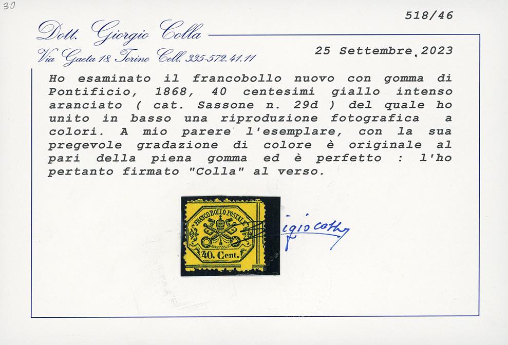 1868 - 40 cent. giallo intenso aranciato (29d), nuovo, gomma originale, perfetto e molto fresco. Rara gradazione di colore. G.Bolaffi, A.Diena, cert. Colla.