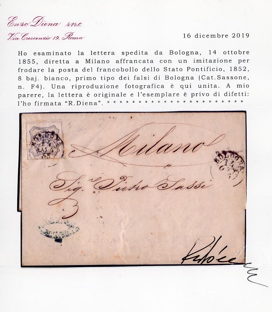 1855 - 8 baj bianco, falso per posta di Bologna, I tipo (F4), perfetto, su lettera da Bologna 14/10/1855 a Milano. Rara. Cert. Diena.