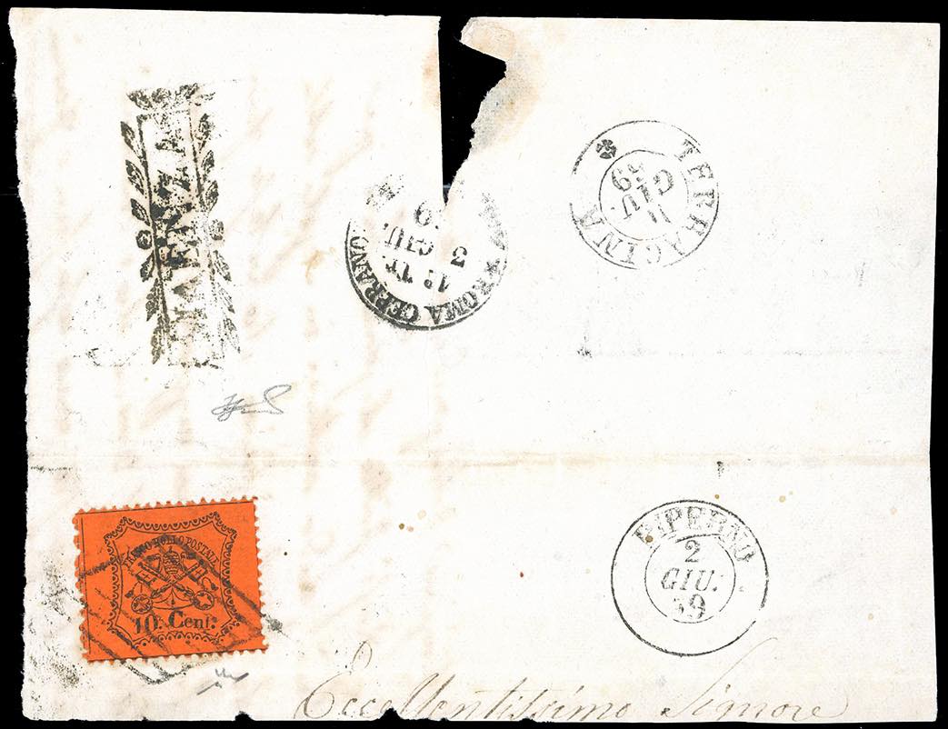 MAENZA, FD punti R1 - 10 cent. (26), perfetto, su ampio frammento di lettera per Terracina 4/6/1869. Raro annullo, ben impresso. Ferrario.