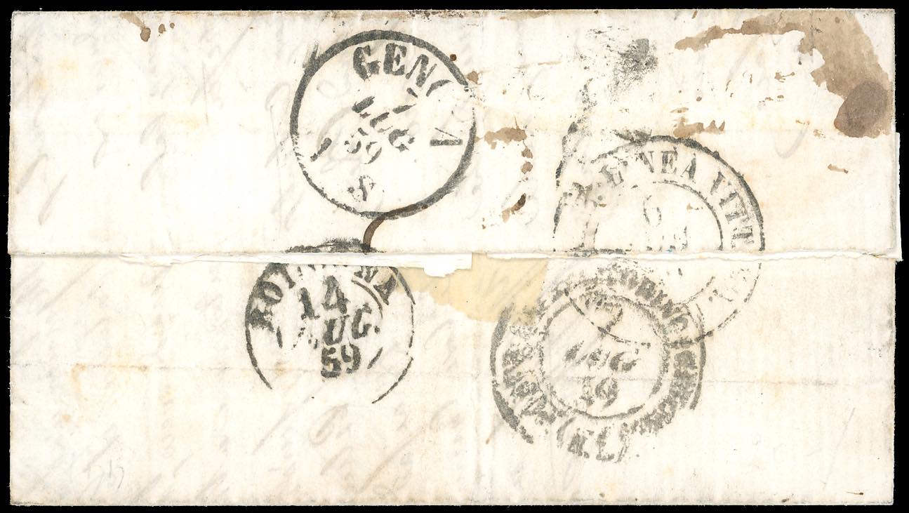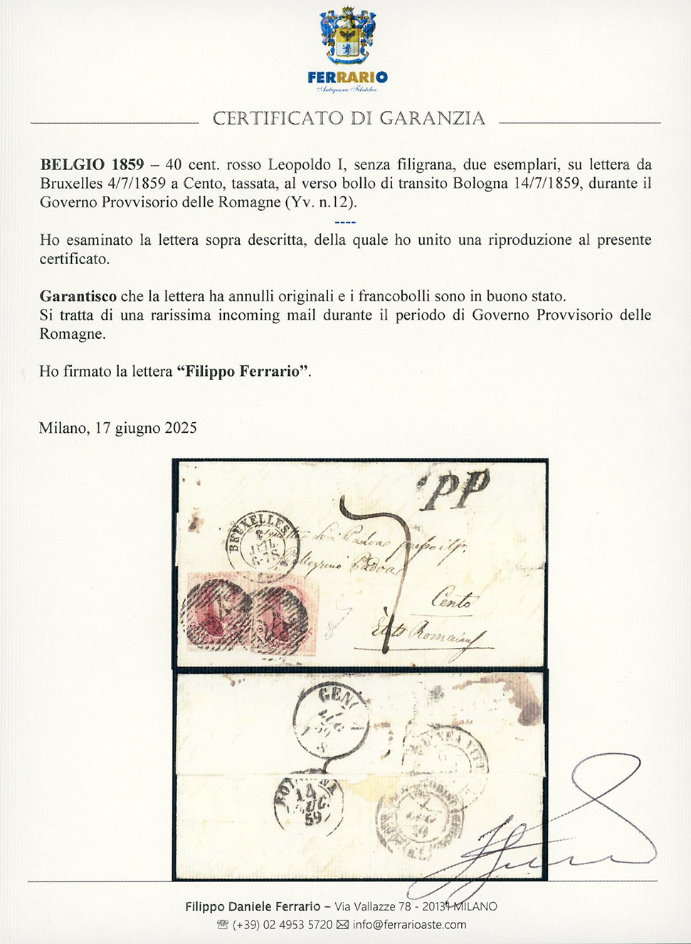 INCOMING MAIL BELGIO 1859 - 40 cent. rosso Leopoldo I, senza filigrana (Yv.12), due esemplari, difettosi, su piccola lettera da Bruxelles 4/7/1859 a Cento, tassata, al verso bollo di transito Bologna 14/7/1859. Rarissima provenienza in periodo di Governo Provvisorio delle Romagne. Cert. Ferrario.