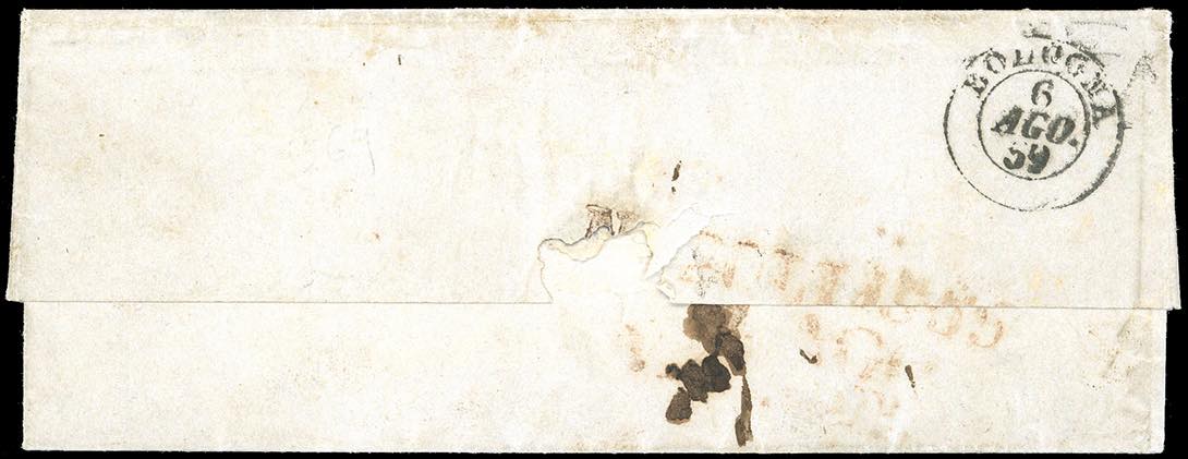INCOMING MAIL NAPOLI 1859 - 5 grana rosa brunastro, I tavola (8), tre ottimi margini, perfetto in alto, su lettera da Napoli 31/7/1859 a Bologna, bollo di arrivo al verso del 6/8/1859, tassata 10 baj. Provenienza molto rara in periodo di Governo Provvisorio delle Romagne, pochissime lettere note. Ferrario.