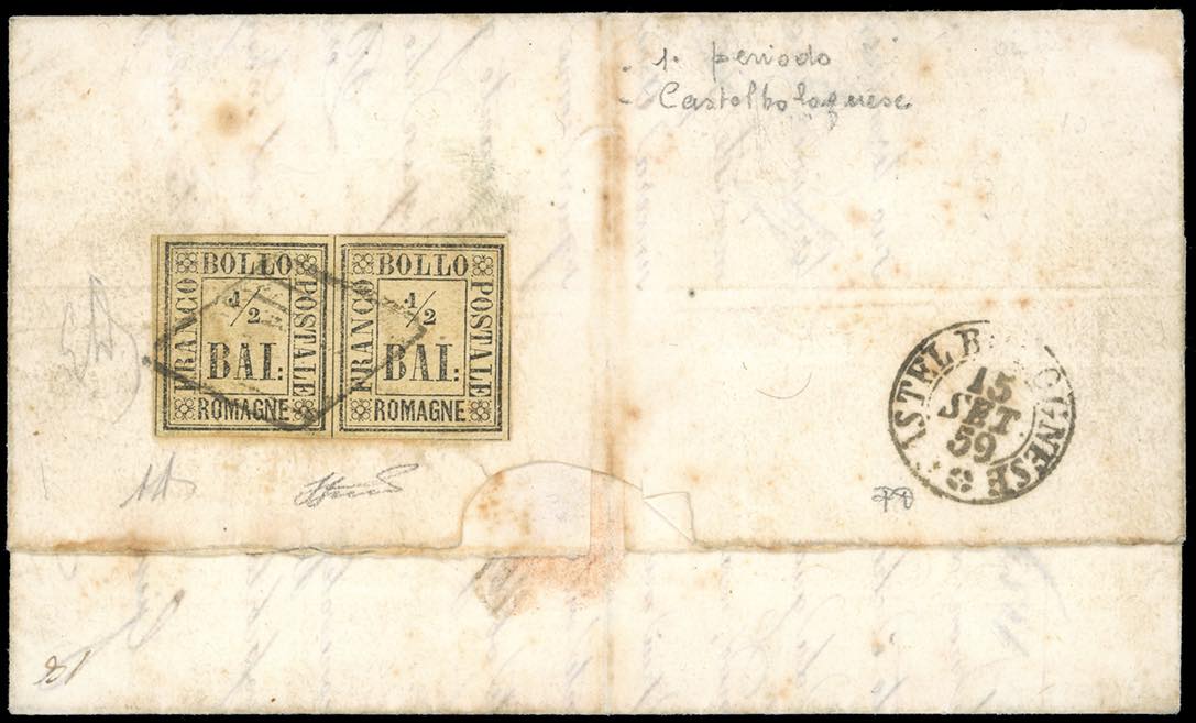 1859 - 1/2 baj giallo paglia (1), coppia perfetta, al verso di busta in porto assegnato da Castelbolognese 15/9/1859 a Faenza (punti 9). Emilio e Alberto Diena, Ferrario.