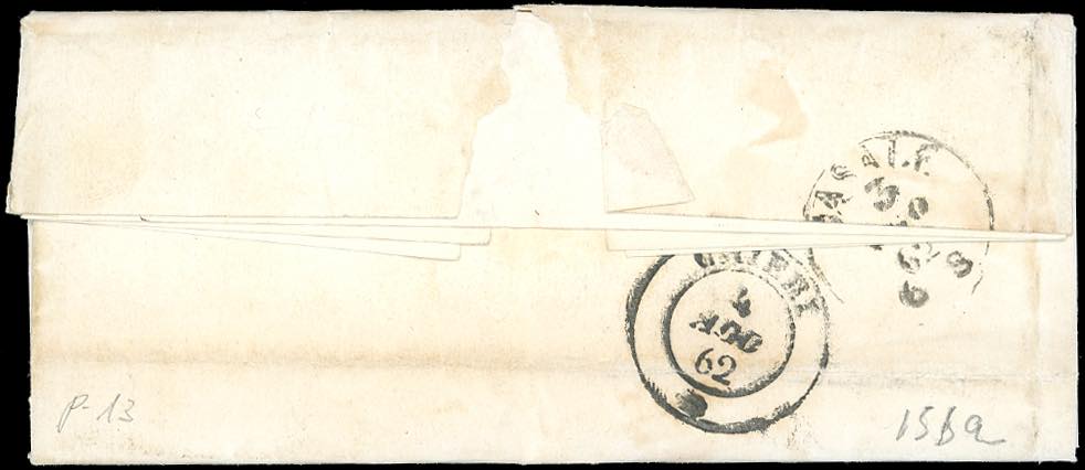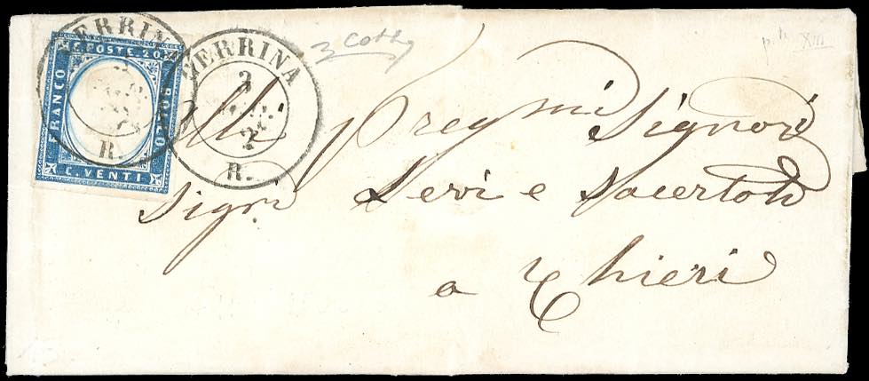 PIEMONTE-CERRINA, punti 13 - 20 cent. (15Da), perfetto, su lettera del 3/8/1862 per Chieri. Pregevole annullo, impronta molto nitida. Cert. Colla.