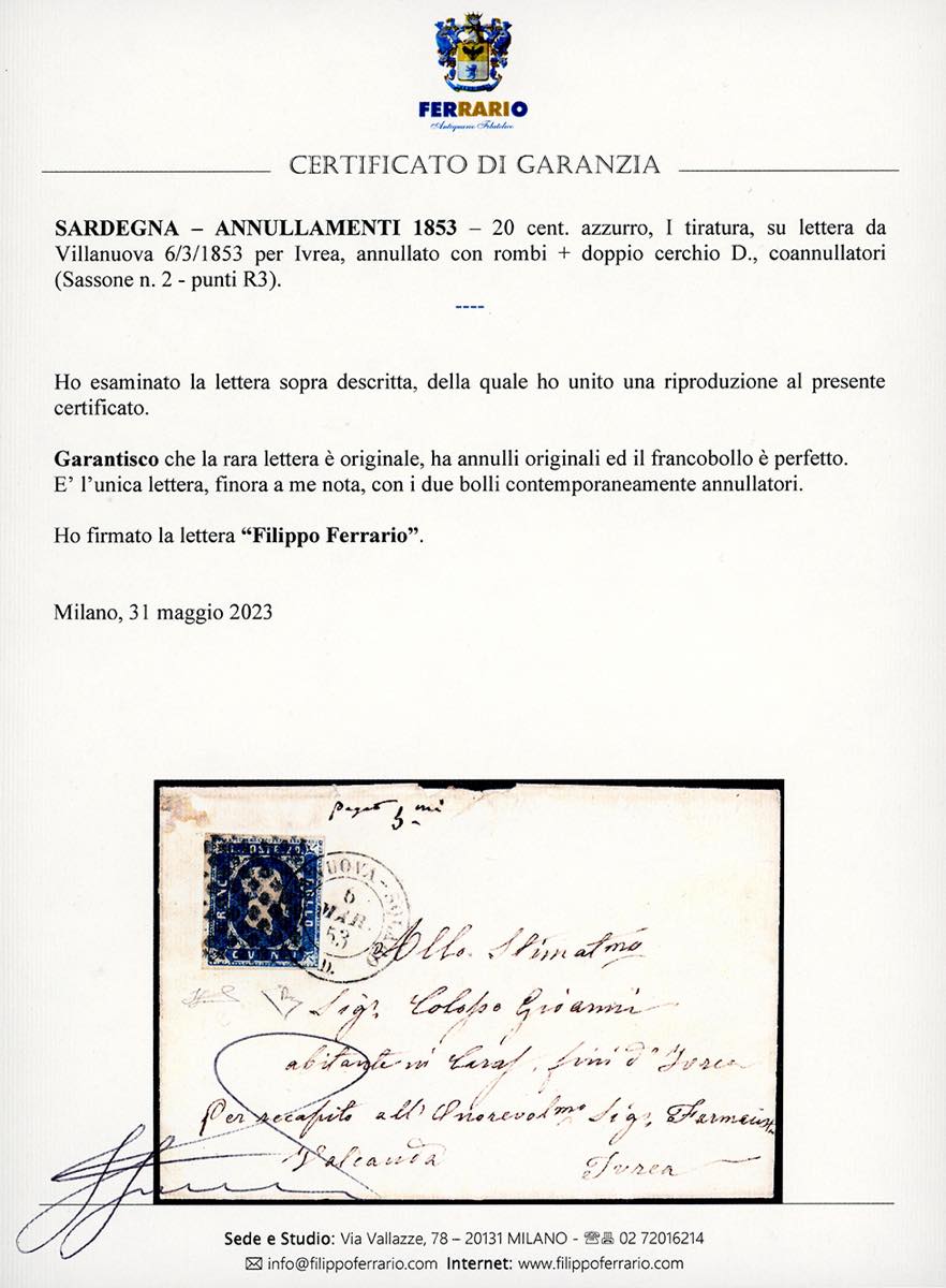 PIEMONTE-VILLANUOVA-SOLARO, rombi + doppio cerchio D punti R3 - 20 cent. azzurro (2), tre ampi margini, giusto a destra, su fresca lettera del 6/3/1853 per Ivrea. Splendida ed unica lettera nota con i due bolli contemporaneamente annullatori. RARITA' DEGLI ANNULLAMENTI DEL REGNO DI SARDEGNA. Cert. E.Diena, Ferrario.