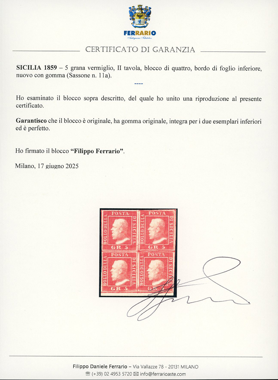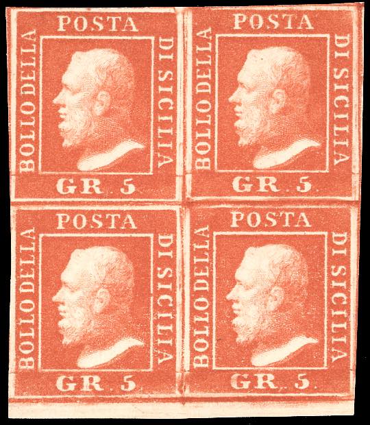 1859 - 5 grana vermiglio vivo, II tavola (11a), blocco di quattro, piccolo bordo di foglio in basso, nuovo, gomma originale, integra per i due esemplari inferiori, perfetto e molto fresco. Ottima qualità. E.Diena, cert. Ferrario.