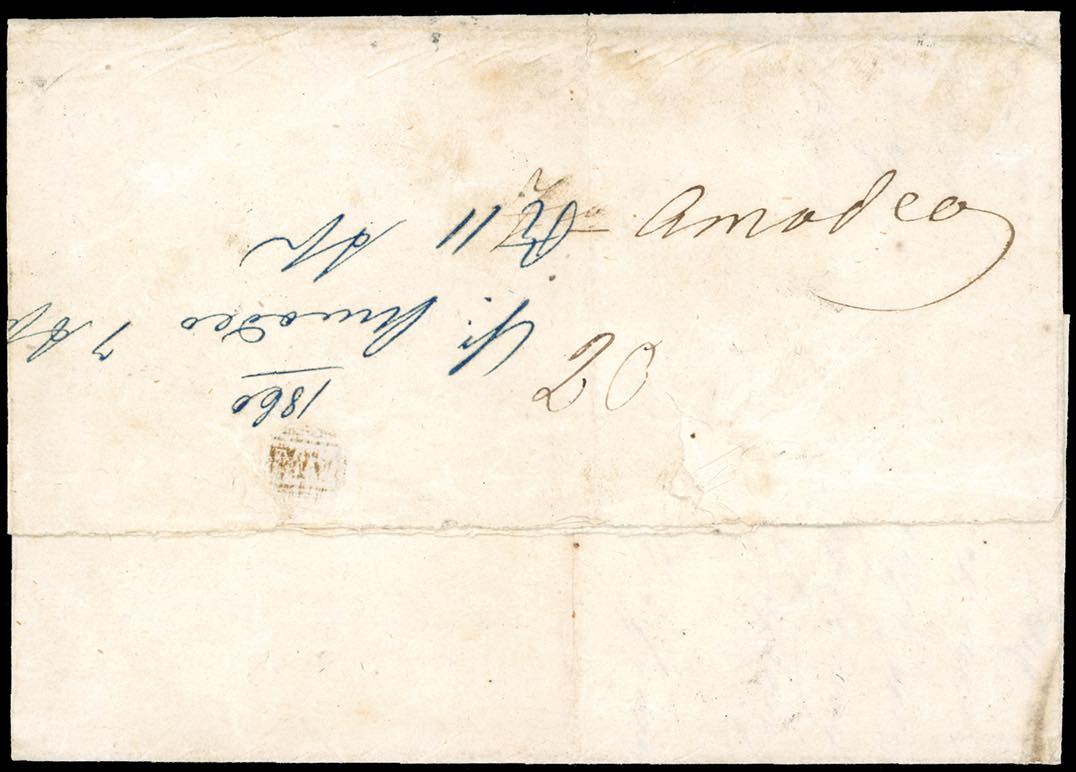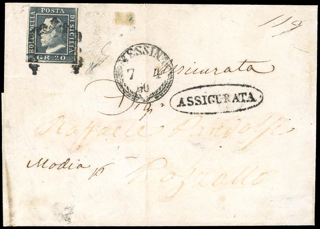 1860 - 20 grana grigio ardesia (13), tre ottimi margini, a filo in alto, isolato su assicurata da Messina 7/4/1860 a Pozzallo. La lettera ... Leggi tutto