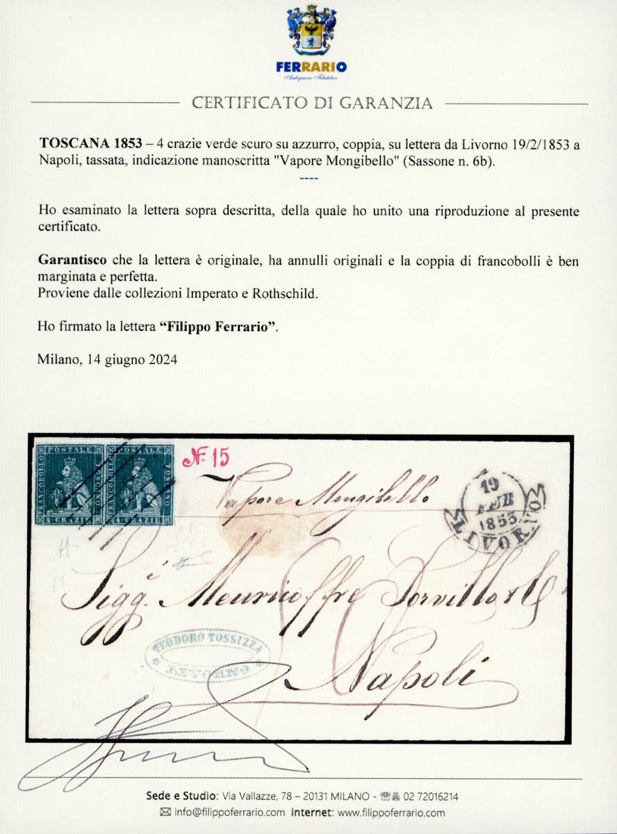 1853 - 4 crazie verde scuro su carta azzurra (6b), coppia perfetta, ben marginata, su fresca lettera da Livorno 19/2/1853 a Napoli, tassata, indicazione manoscritta "Vapore Mongibello". Insieme pregevole, di ottima qualità. Emilio e Alberto Diena, cert. Ferrario. Ex coll. Imperato e Rothschild.