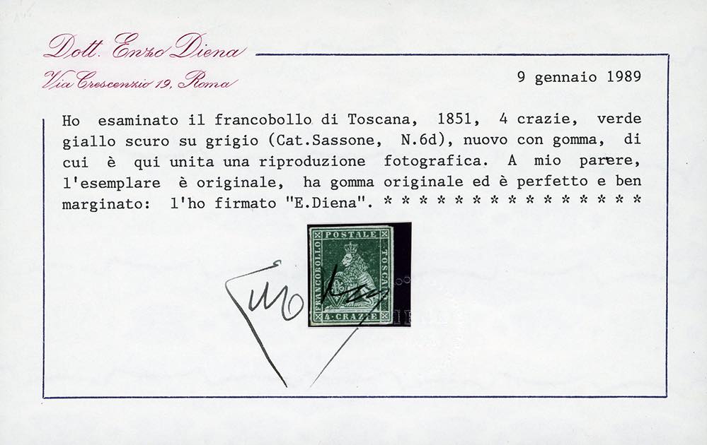 1851 - 4 crazie verde giallo scuro su grigio (6d), nuovo, gomma originale, perfetto e ben marginato. Raro. Giorgio Colla, cert. E.Diena ... Leggi tutto