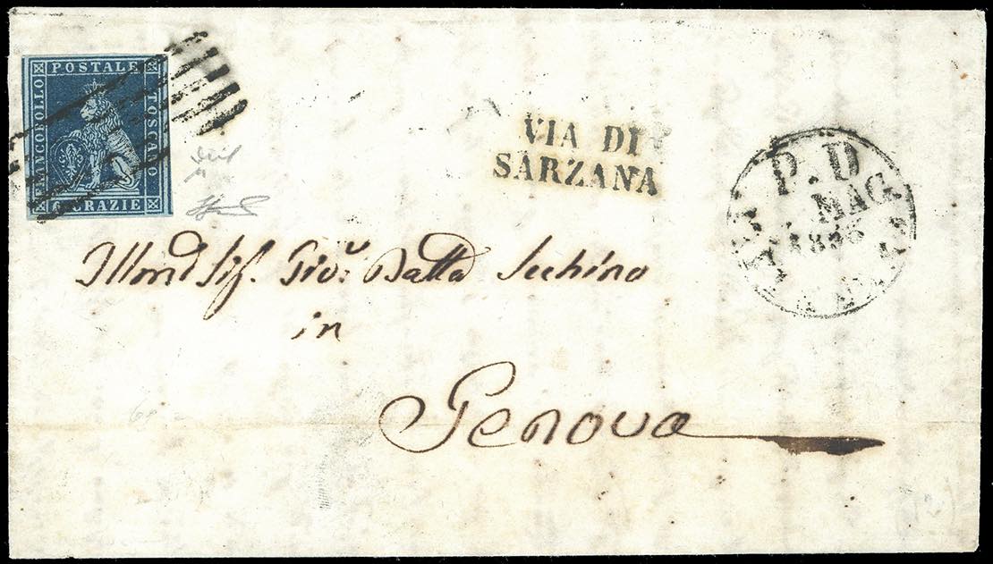 1853 - 6 crazie azzurro scuro su azzurro (7c), perfetto e con ampi margini su tutti i lati, su lettera da Firenza 3/5/1853 a Genova, lineare su due righe "via di Sarzana" sul fronte. Splendida. Chiavarello, Ferrario.