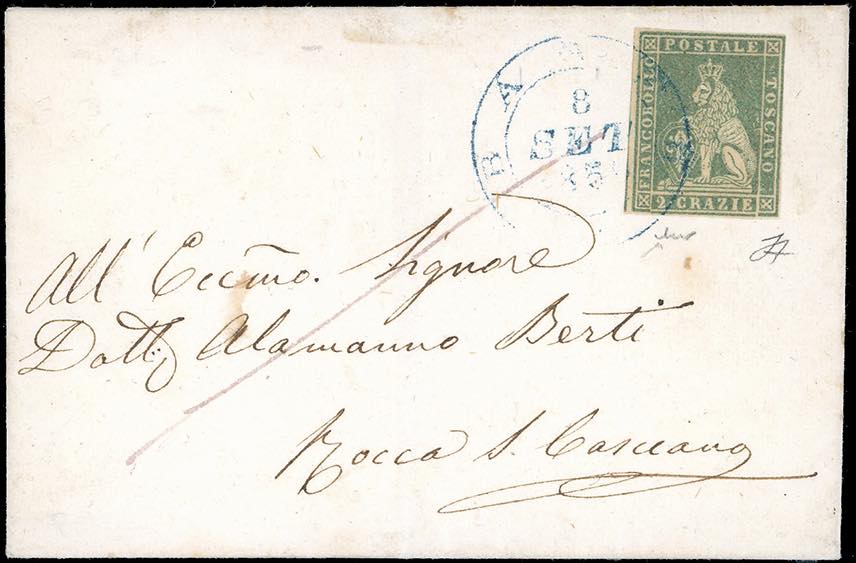 1858 - 2 crazie verde grigio giallastro, II emissione (13b), ottimo stato, su fresca lettera da Bagno 8/9/1858 (?), doppio cerchio grande in azzurro punti 9, a Rocca San Casciano. Ottimo aspetto. Chiavarello, Ferrario. Ex coll. Imperato.