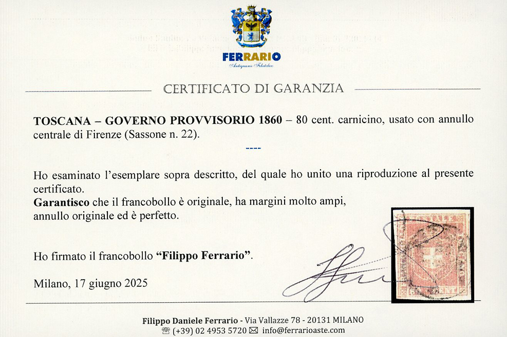 1860 - 80 cent. carnicino (22), usato con annullo centrale di Firenze, perfetto. Margini enormi e colore vivace. Uno dei migliori esemplari esistenti. Cert. Ferrario.