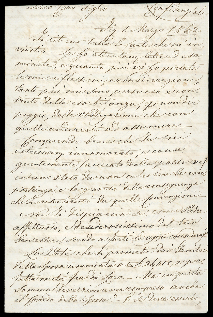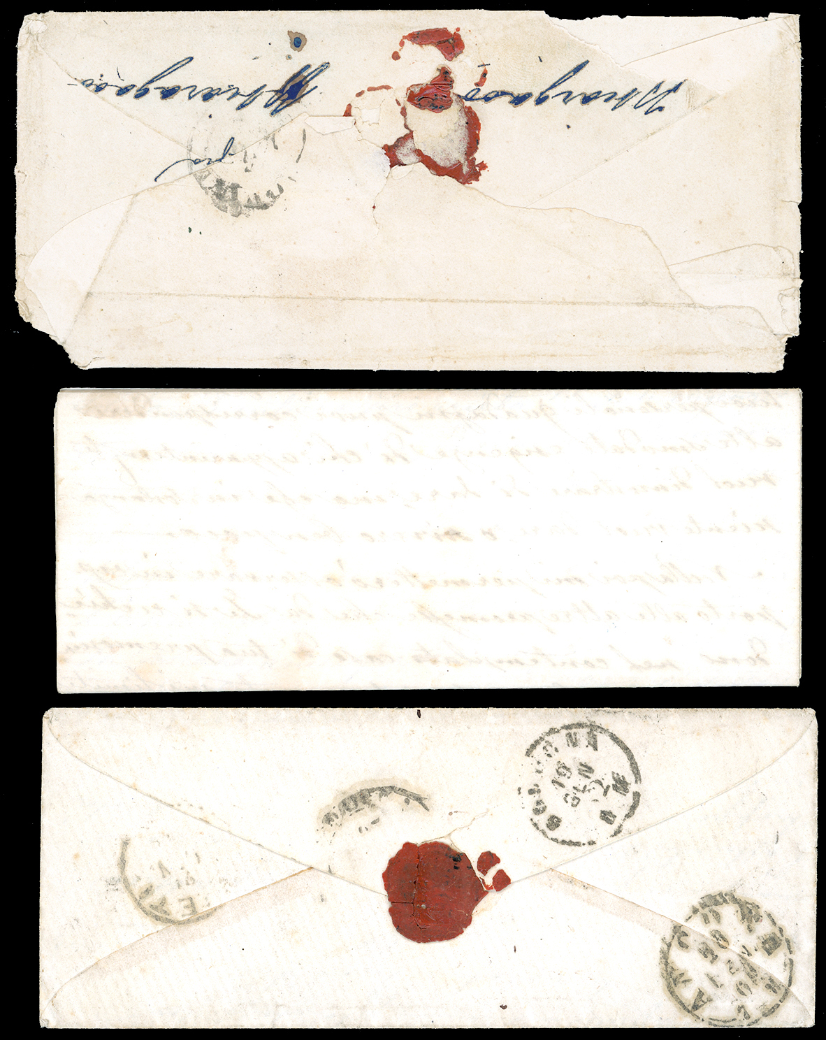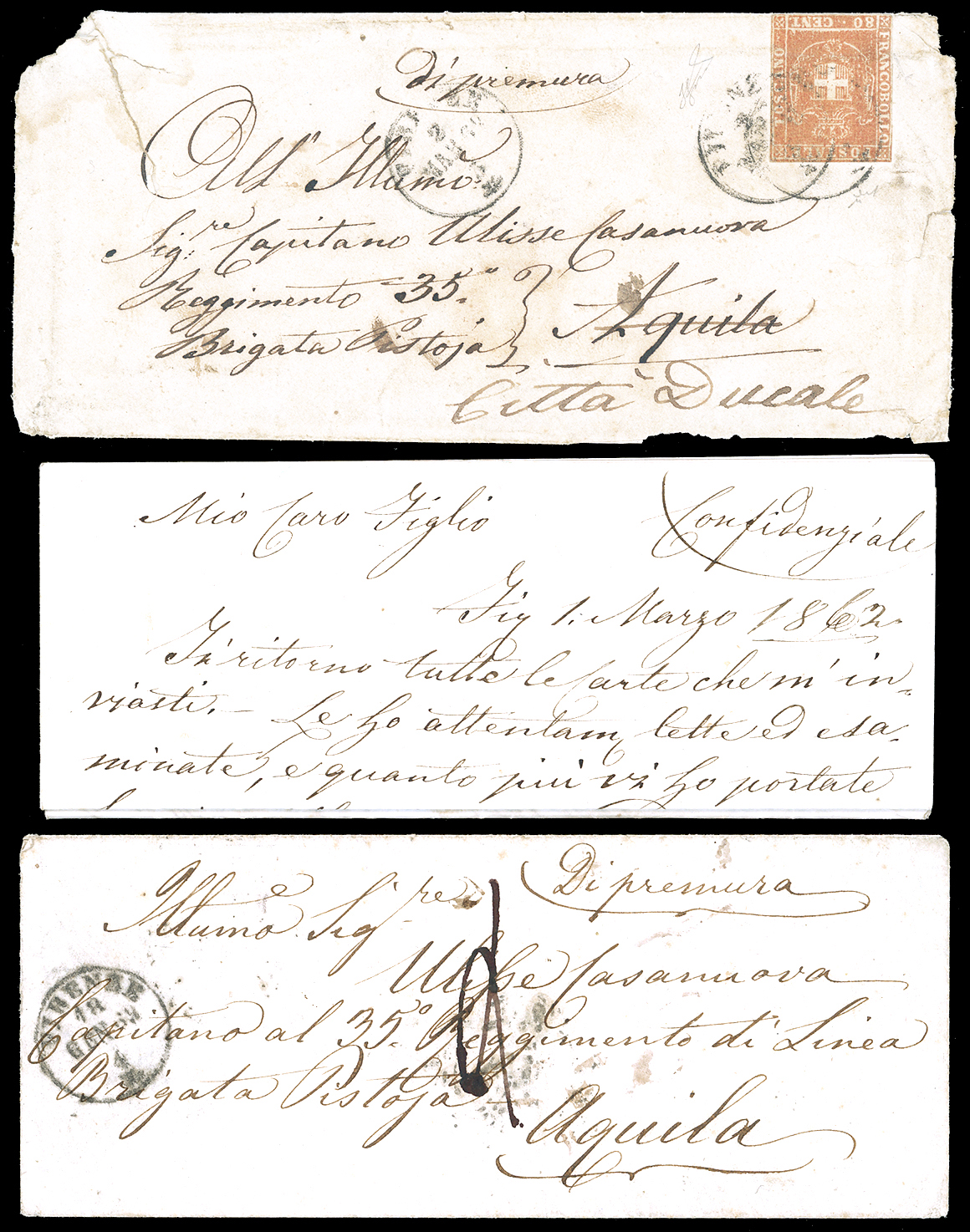 1862 - 80 cent. carnicino (22), difetti, su busta di 4 porti da Firenze 2/3/1862 a L'Aquila, rispedita a Città Ducale, indirizzata ad un Capitano della Brigata Pistoja, allegato il testo interno. Unita una busta dello stesso archivio spedita non affrancata da Firenze 18/1/1862 a L'Aquila. Rarissimo porto multiplo per l'interno, UNICA FINORA NOTA. Chiavarello per la lettera affrancata e cert. Ferrario. Ex coll. Imperato.