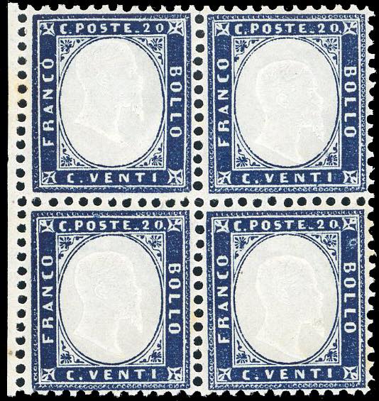 1862 - 20 cent. indaco (2), ottima centratura, blocco di quattro esemplari, bordo di foglio, nuovo, gomma oriignale integra, perfetto. ... Leggi tutto