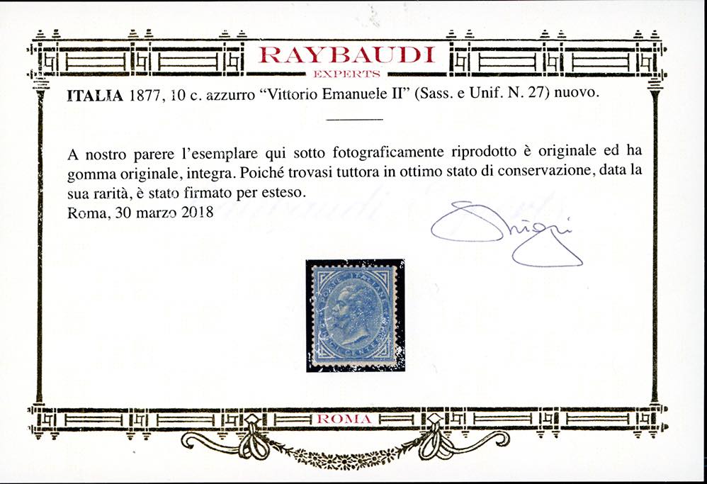 1877 - 10 cent. azzurro (27), buona centrattura, gomma originale integra, perfetto e molto fresco. E.Diena, cert. Oro Raybaudi.