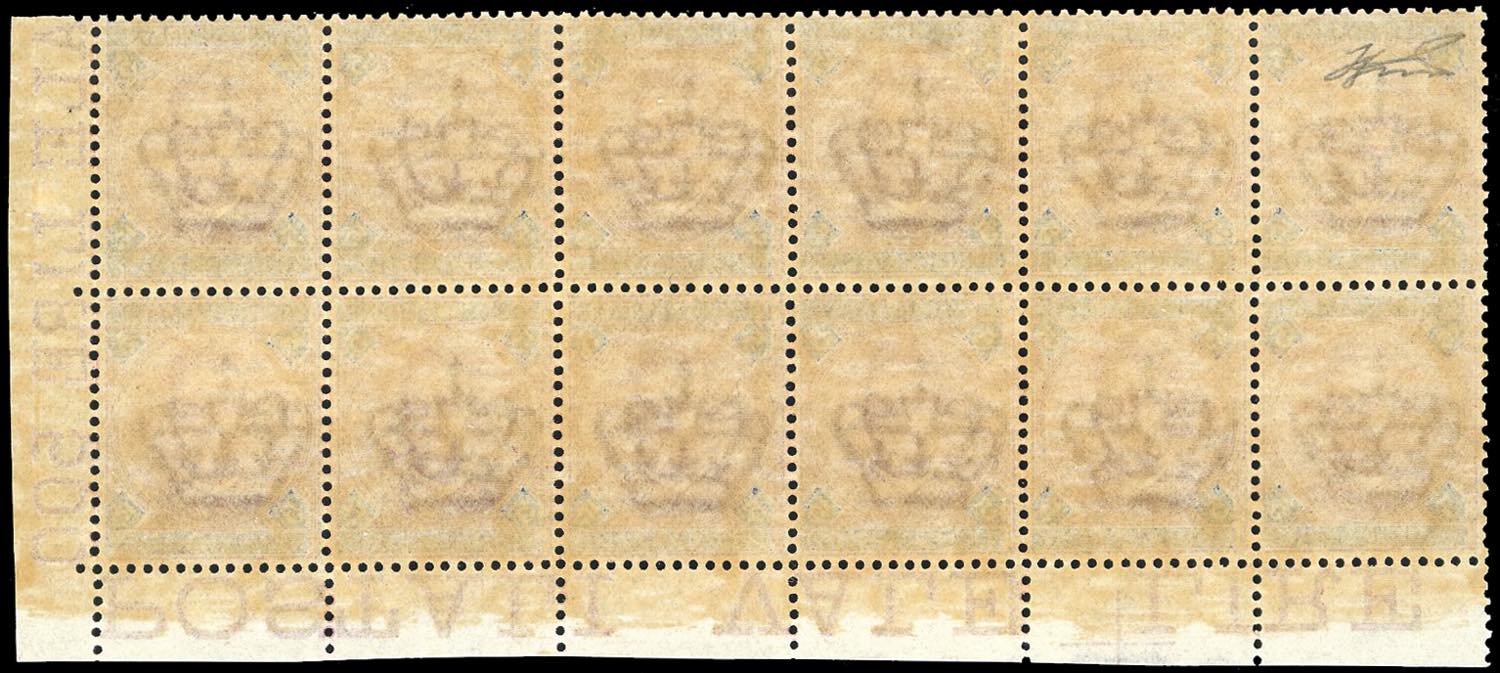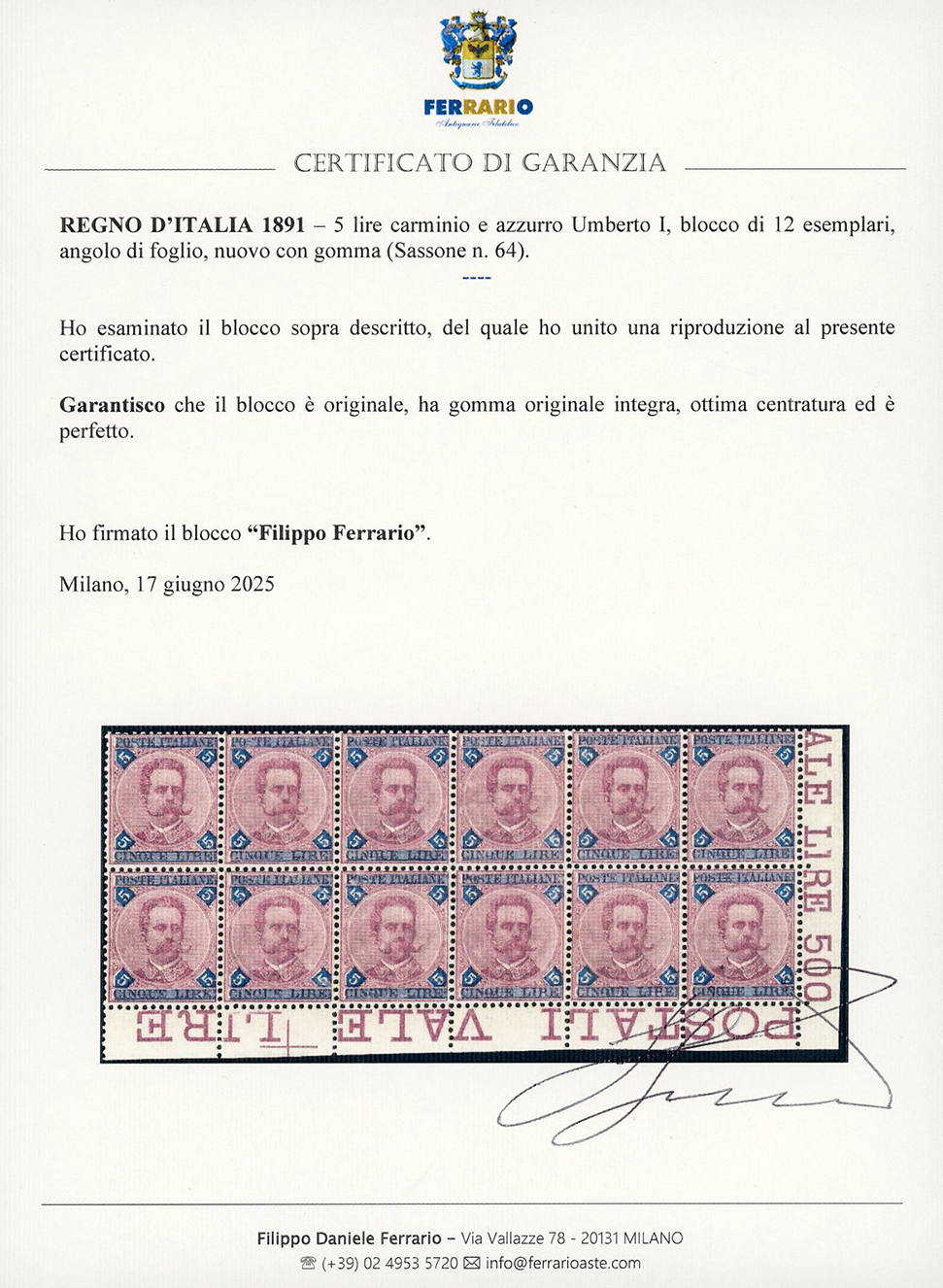 1891 - 5 lire carminio e azzurro Umberto I (64), ottima centratura, blocco di 12 esemplari, angolo di foglio, nuovo, gomma originale ... Leggi tutto