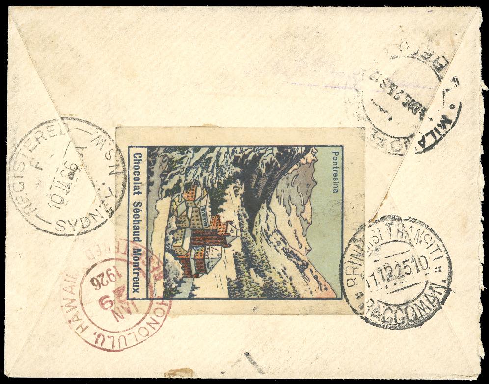1925 - 40 cent. Michetti (84), coppia e striscia di tre, perfette, su busta raccomandata da Ponte Chiasso 9/12/1925 ad Honolulu, isole Hawai, bolli di transito e di arrivo al verso, nonché una bella etichetta chiudilettere illustrata. Rara ed affascinante destinazione. Vaccari.