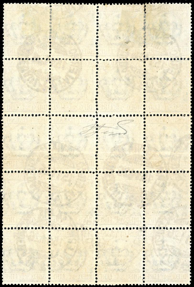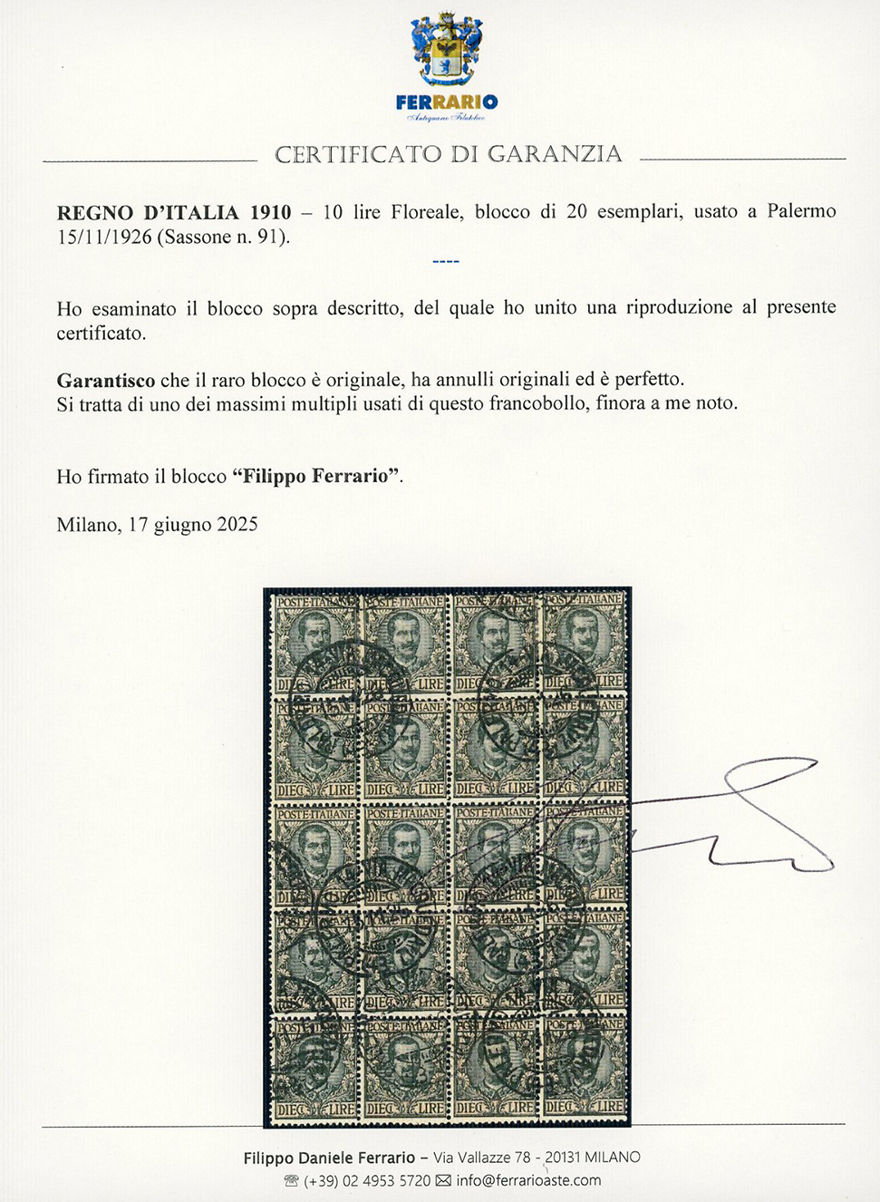 1910 - 10 lire Floreale (91), blocco di 20 esemplari, usato a Palermo 15/11/1926, uno dei massimi multipli usati di questo francobollo. Molto raro. Cert. Ferrario.