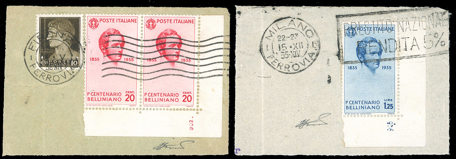 1935 - 20 cent. coppia orizzontale, e 1,25 lire Bellini (388,391), entrambi angolo di foglio con numero di cilindro, perfetti, usati su due frammenti. Rari. Ferrario.