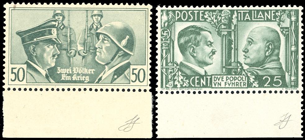 1941 - 25 cent. e 50 cent. Asse Roma-Berlino, imitazioni di guerra (IG454/IG455), bordo di foglio in basso, nuovi, gomma originale integra, perfetti e molto freschi. Rari e di ottima qualità. Cert. Ferrario.