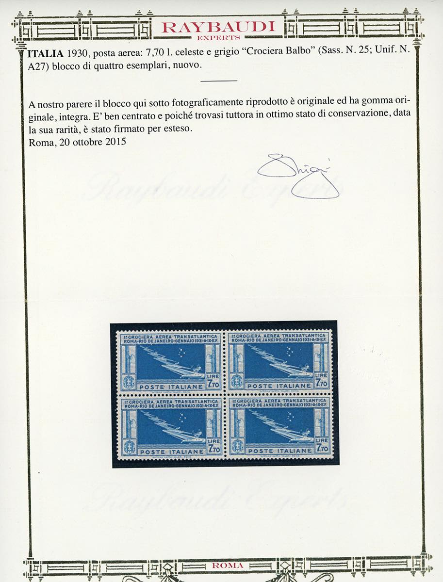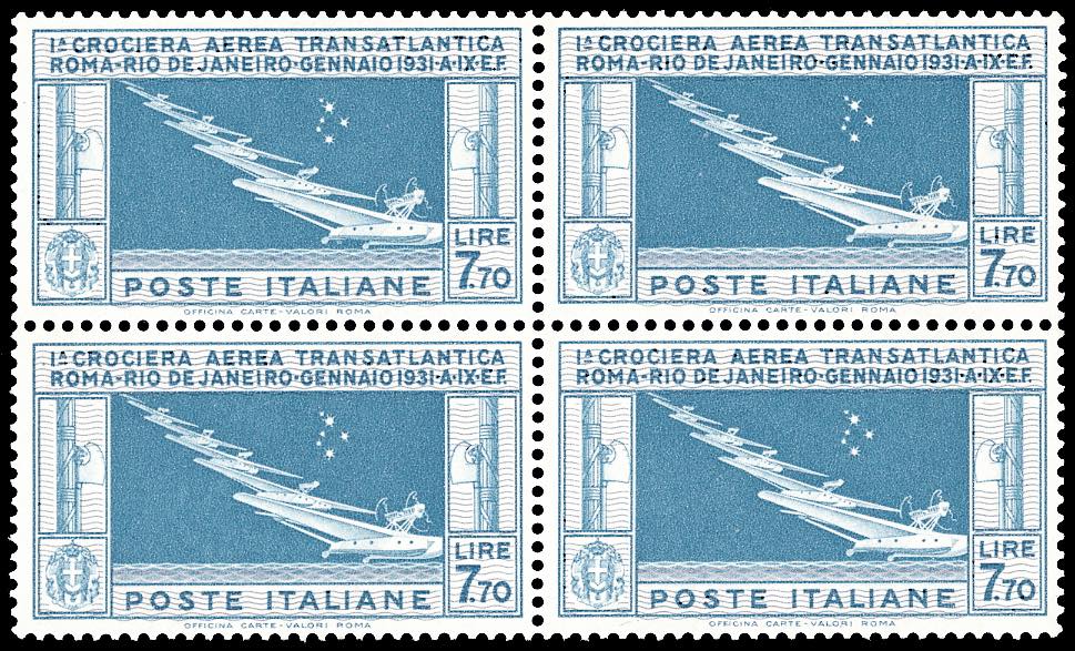 1930 - 7,70 lire Crociera Balbo (25), buona centratura, blocco di quattro, gomma originale integra, perfetto. Cert. E.Diena e Oro Raybaudi (cat.Sassone € 6.500/8.125).