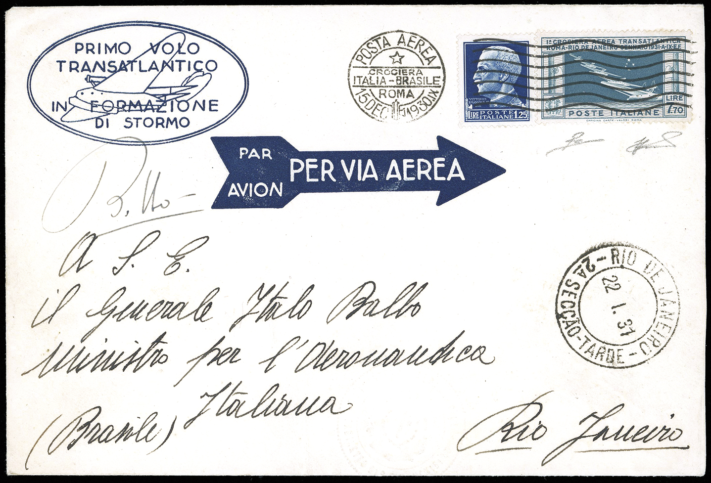 1930 - 7,70 lire Crociera Balbo (25), perfetto, con valore complementare da 1,25 lire Imperiale, su aerogramma da Roma 15/12/1930 a Rio de Janeiro, bollo di arrivo, con la sola firma del Generale Balbo. Ottima qualità. R.Diena, cert. Ferrario.