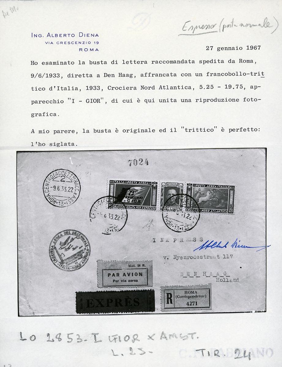 1933 - 5,25 + 19,75 lire Trittico I-GIOR (51C), perfetto, su aerogramma raccomandato espresso da Roma 9/6/1933 per l'Olanda, bolli di transito e di arrivo al verso e bolli speciali della Crociera Nord Atlantica. Cert. A.Diena.