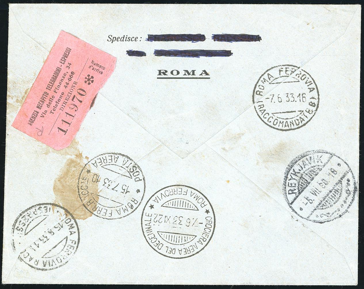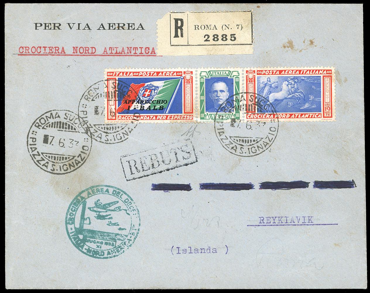 1933 - 5,25 + 19,75 lire Trittico I-BALB (51A), ottimo stato, su aerogramma raccomandato da Roma 7/6/1933 a Reykjavik, in Islanda, bollo di arrivo al verso, bolli speciali della Crociera sul fronte e al verso. Cert. A.Diena.