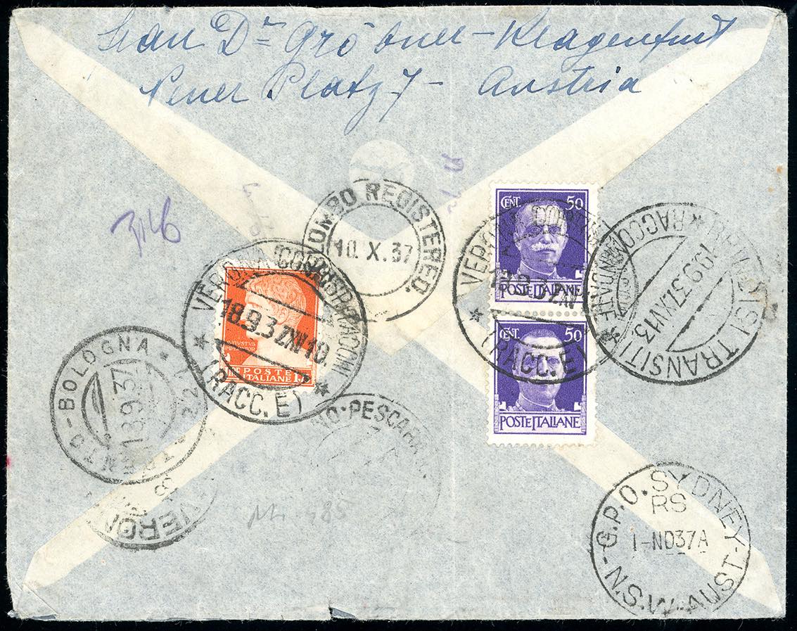 1937 - Colonie estive, serie completa, con complementari al verso (A100/A105,251,254), perfetti, su aerogramma raccomandato da Verona 19/9/1937 a Colombo, Ceylon, rispedita a Sidney ed infine a Melbourne, in Australia. Insieme raro. Cert. Ferrario.