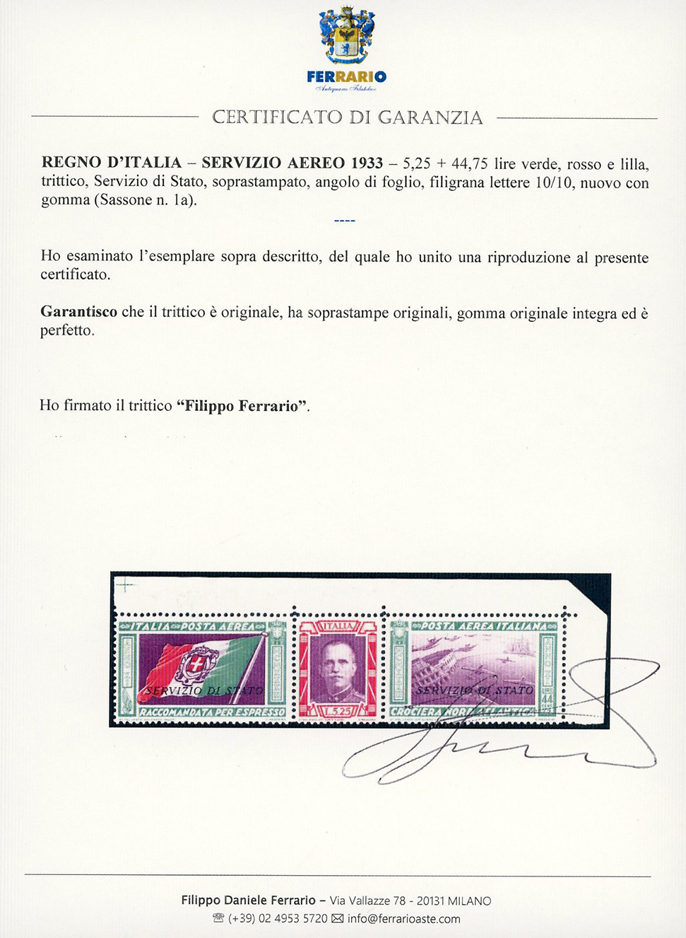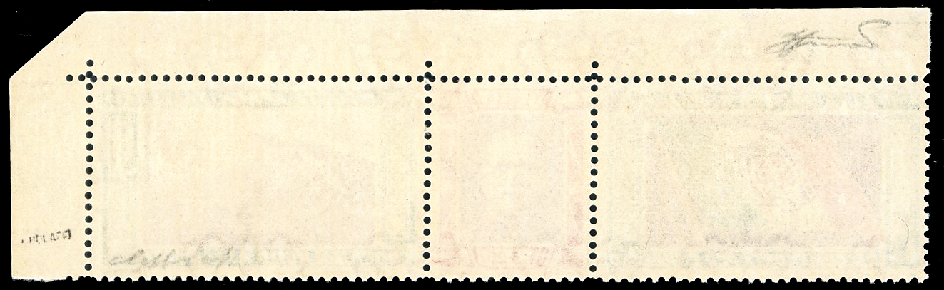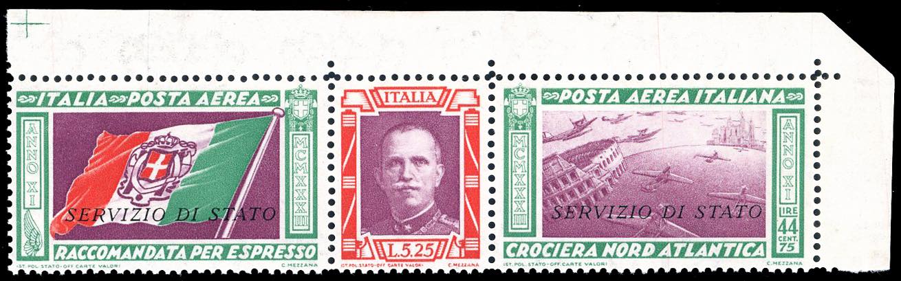 1933 - 5,25 + 44,75 lire Trittico Servizio di Stato, filigrana lettere 10/10 (1a), angolo di foglio, nuovo, gomma originale integra, perfetto. Splendido. G.Bolaffi, cert. Ferrario.