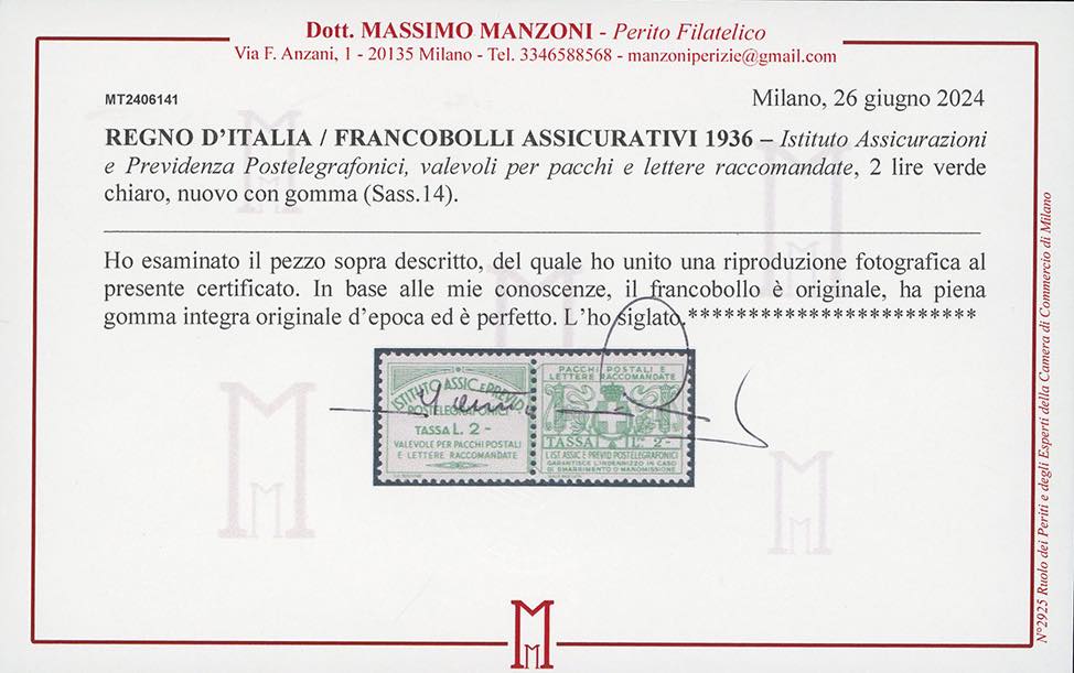 1936 - Istituto Assicurazioni, serie completa (10/16), nuovi, gomma originale integra, leggera traccia di linguella solo per il 10 cent. e il 10 lire, perfetti. Ottima qualità. Tutti firmati Ferrario, cert. Manzoni per il 2 lire.