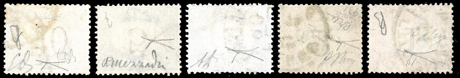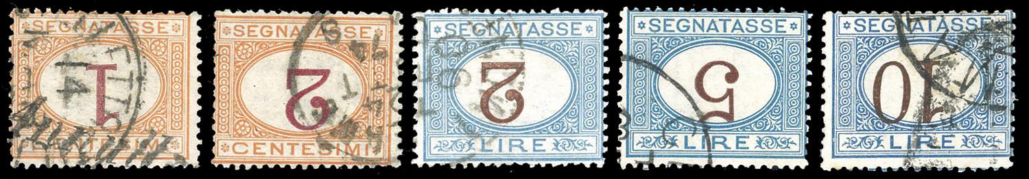 1870/74 - 1 cent., 2 cent., 2 lire, 5 lire, 10 lire, 10 lire, tutti con cifre capovolte (3b,4b,12b,13b,14b), usati, perfetti. Raro insieme. Tutti firmati da noti periti, cert. Bottacchi.