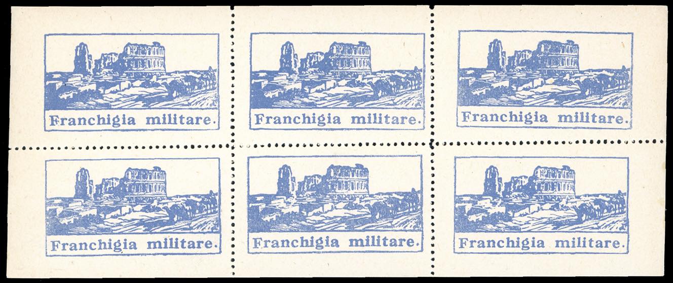 1943 - Franchigia, azzurro oltremare Anfiteatro di El Djem, foglietto di sei esemplari non dentellato sui margini (F1c), gomma originale integra, perfetto. E.Diena, cert. Raybaudi.